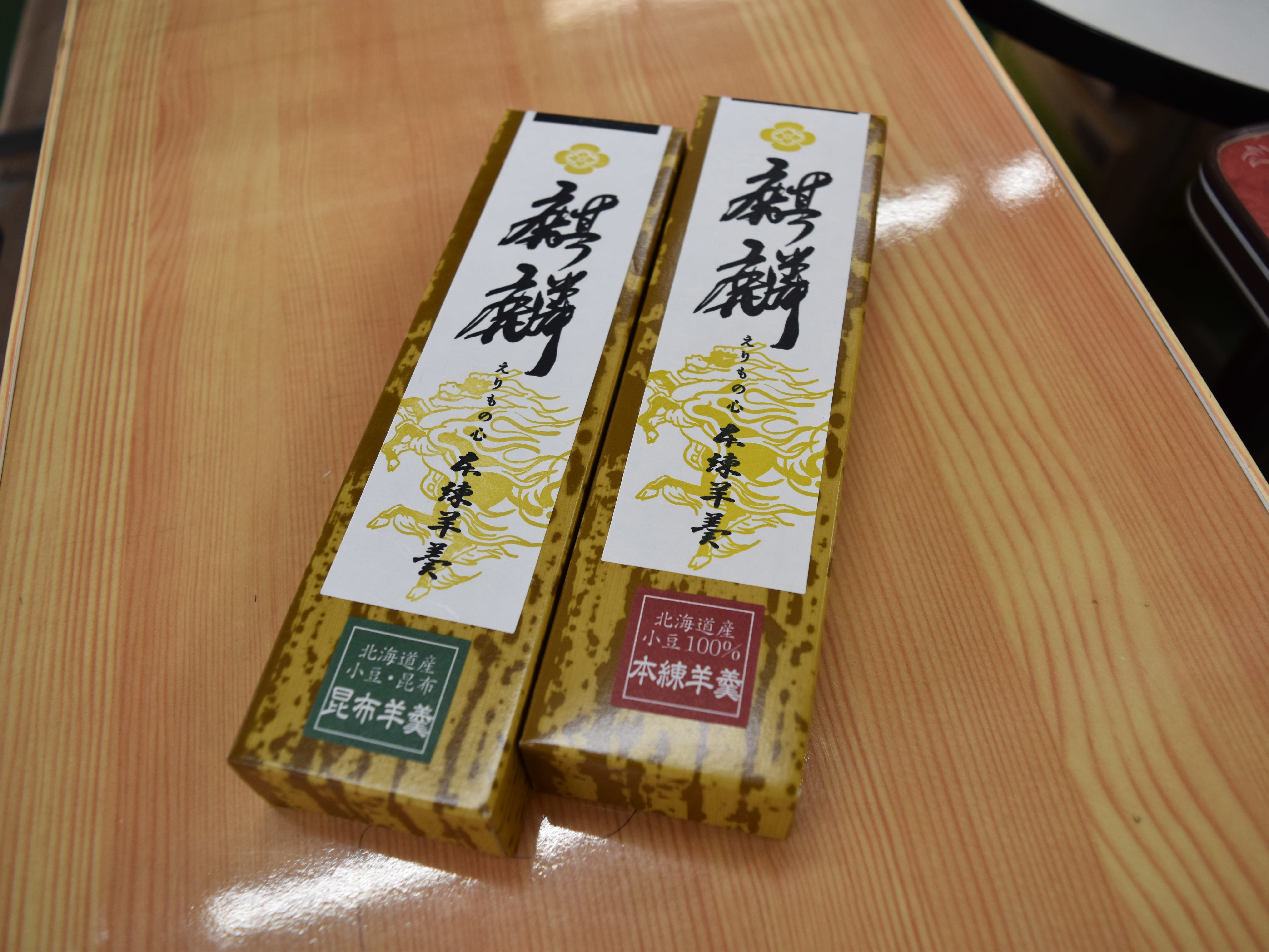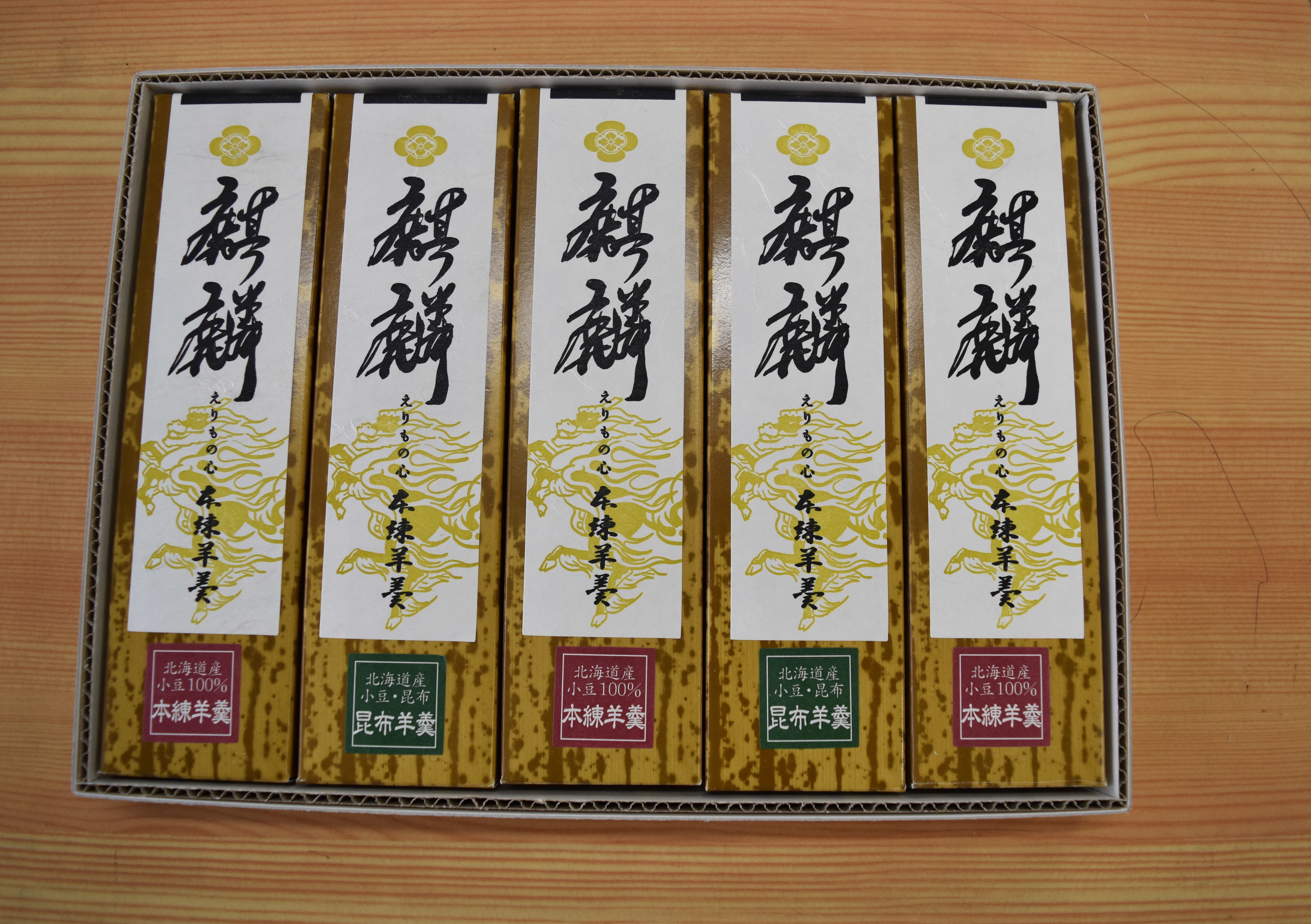 「麒麟」は良いことが起きる前兆「吉瑞」に姿を現すといわれます。これにちなみ、お召し上がりになる方の幸せを願って本品を命名しました。えりも小豆の羊羹とえりも産の日高昆布粉末を使用した2種類ございます。