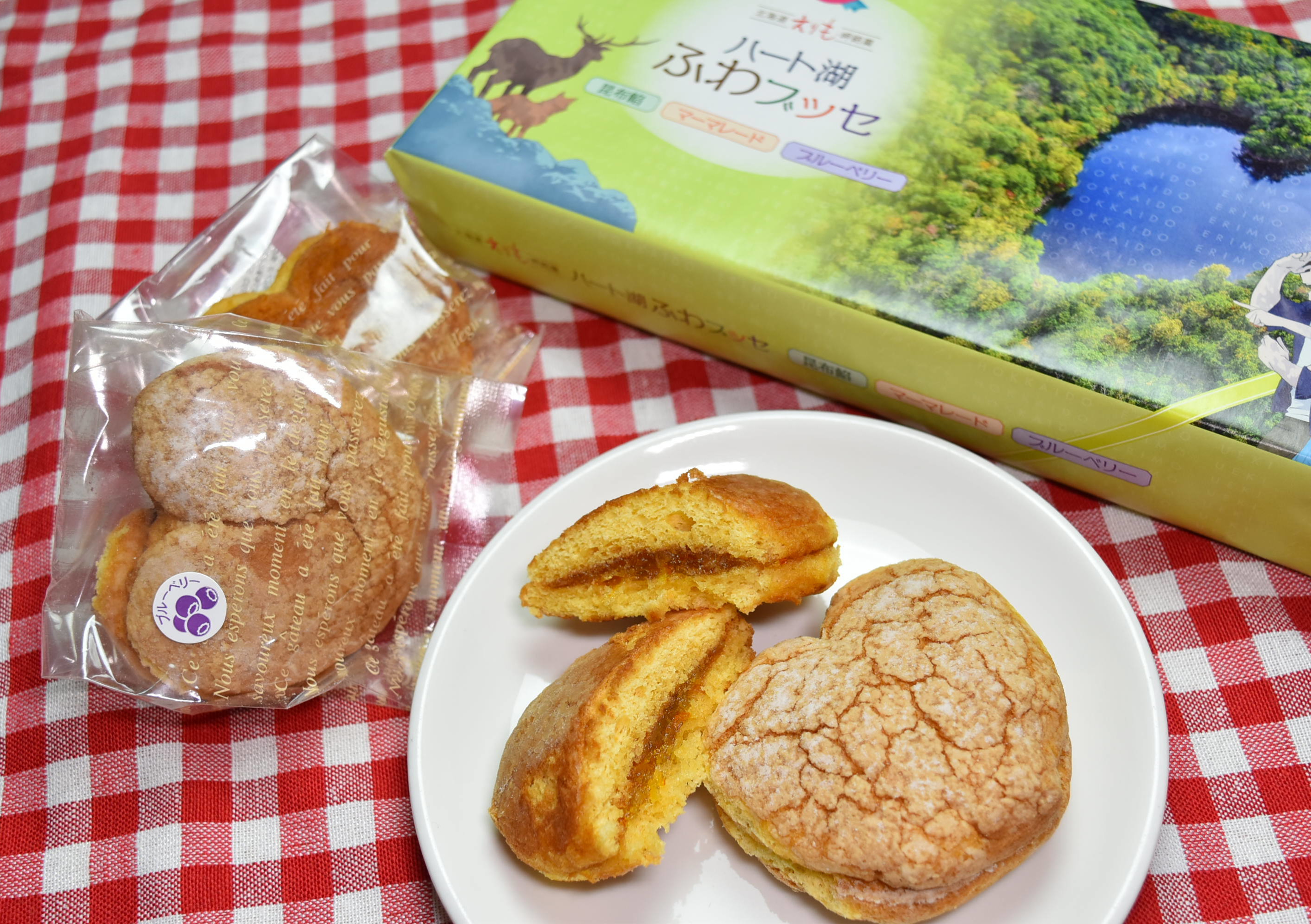 ハートの形をした豊似湖をイメージしたブッセです。ブルーベリー・ママレード・昆布クリームの3つの味が楽しめます。